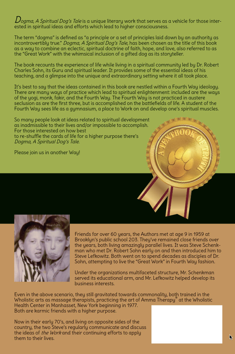 “Dogma, A Spiritual Dog’s Tale,” gives you a front row seat to a Fourth-Way spiritual life. It sheds light on spiritual ashram living, and the practices and difficulties encountered in such circumstances. In this story the ashram’s Teacher or Guru is Dr. Robert C. Sohn, an advanced being whose higher energy and insight was given endlessly to his students in their quest to grow spiritually. For some, this was easier said than done.